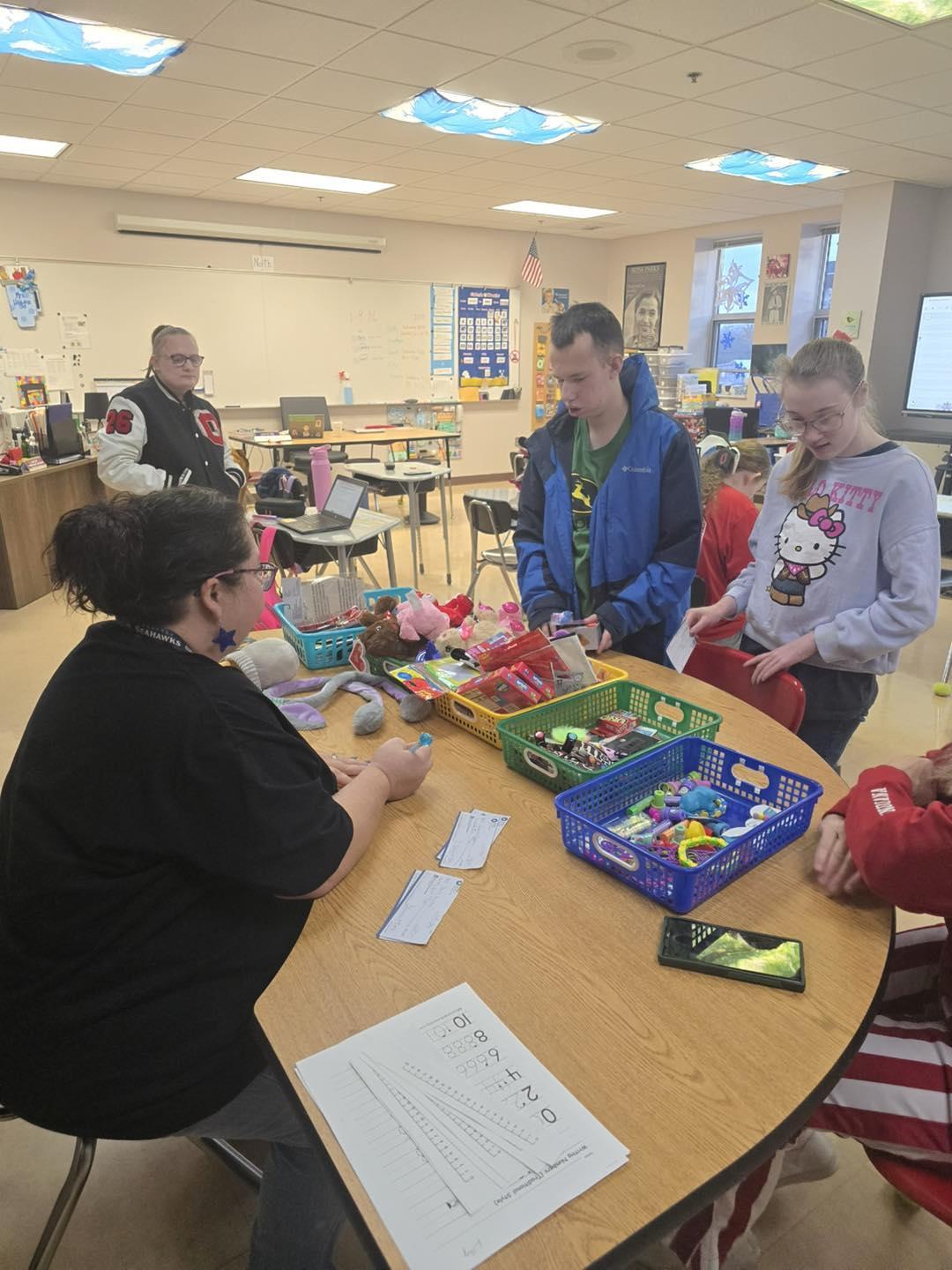 Room 120 works within the business they created, The Orleans Support Staff, to earn a paycheck. They are responsible for package and mail delivery, shredding papers, sharpening pencils and many other jobs within the school. Every two weeks they get their paychecks and they choose if they want to budget and buy in our classroom store, or save for a bigger reward like 30 minutes of their favorite classroom activity. It has been a big success and the kids are learning many real life skills. Way to go life skills kids!!!